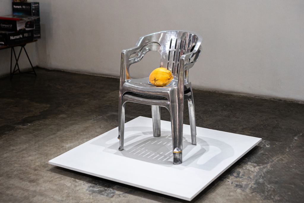 In seeing everyday plastic furniture cast in aluminium we experience a transformation of a temporary state into a more permanent or stable one.
